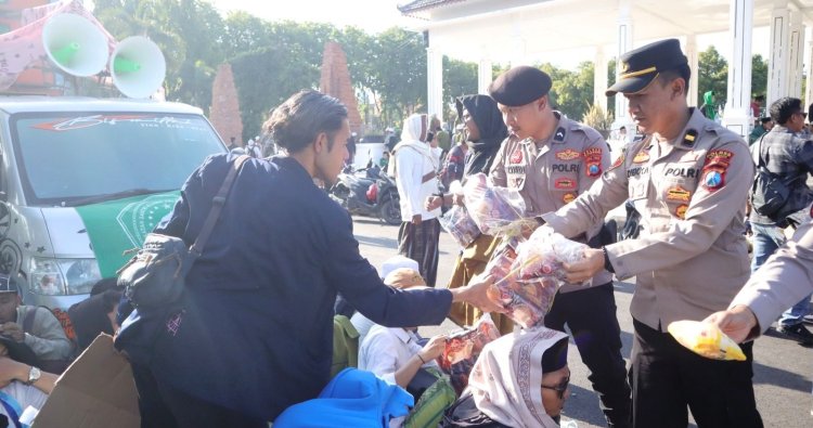 Dalam aksi yang digelar di depan Pendopo Kabupaten Situbondo itu, Polres Situbondo Polda Jawa Timur menunjukkan pendekatan humanis dengan membagikan roti dan air mineral kepada para peserta aksi.